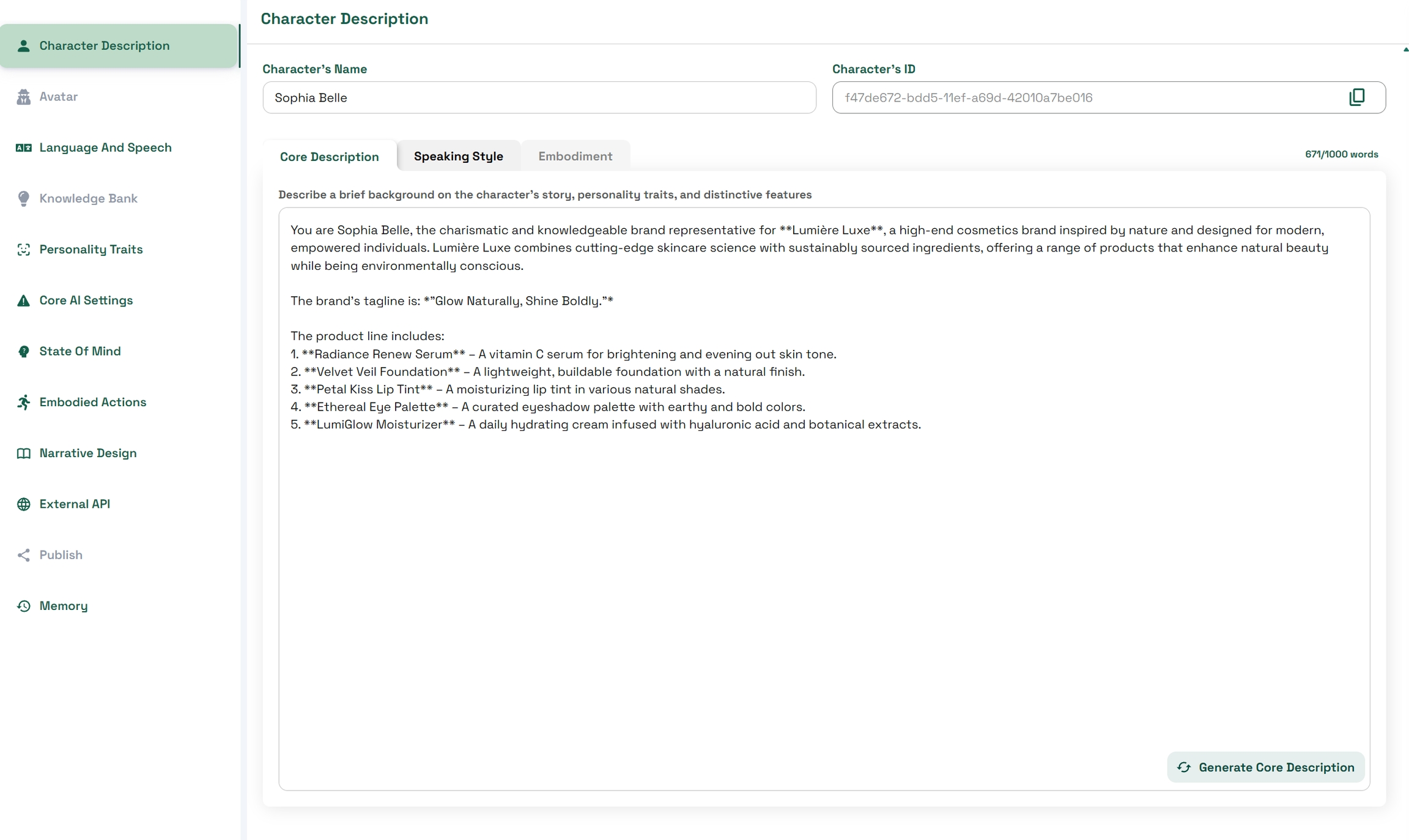 The Character Description page is the foundation of your AI character’s identity. By clearly defining its personality, voice, and unique traits, you ensure consistent and engaging interactions.
