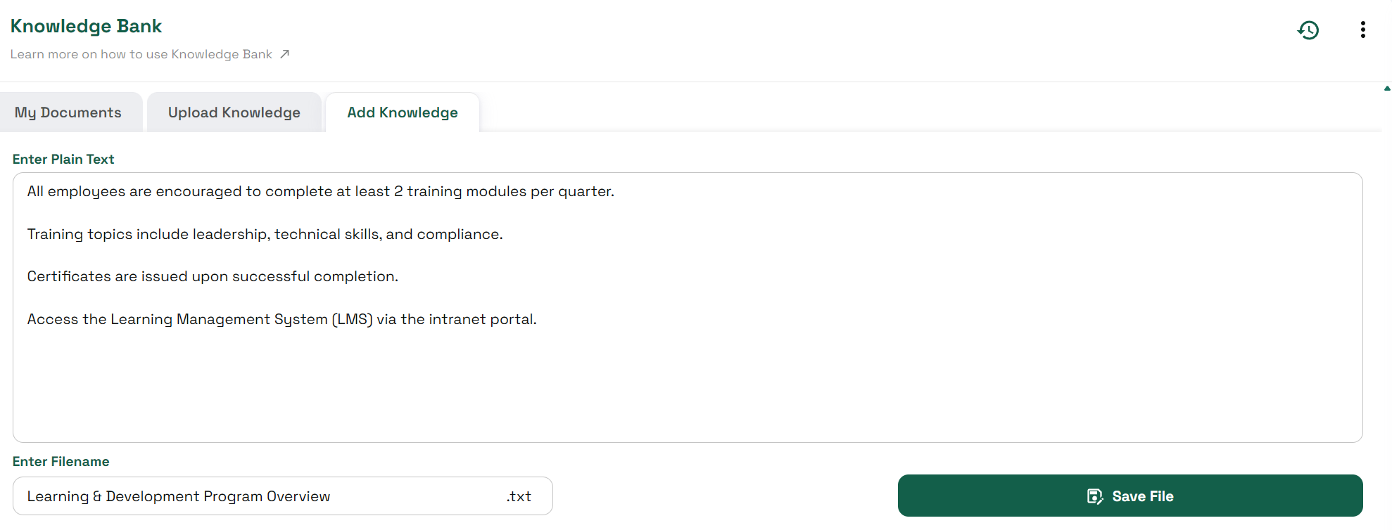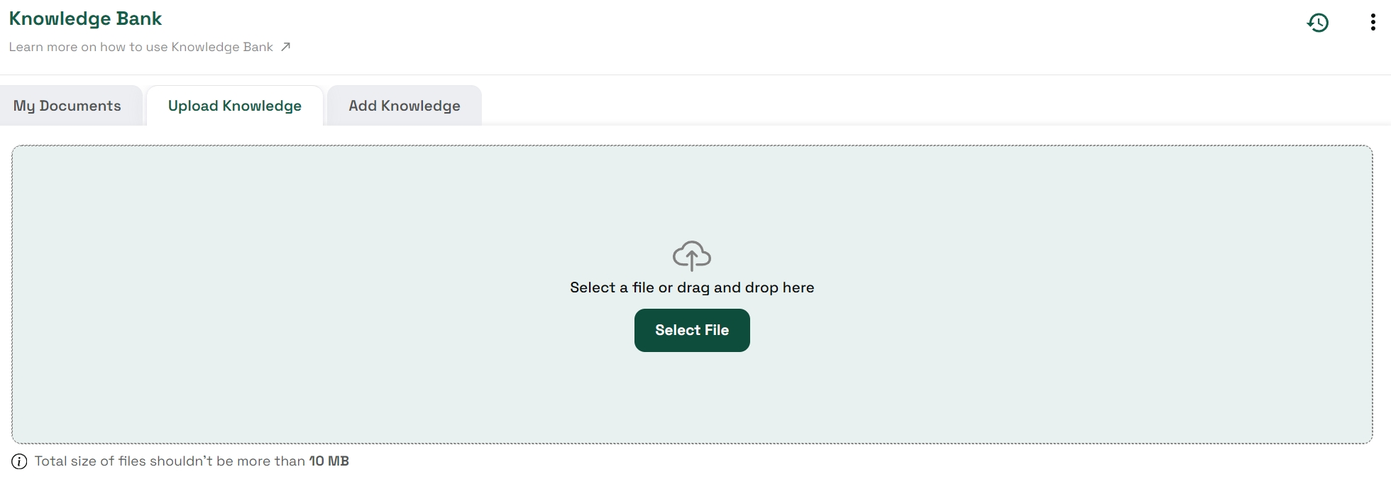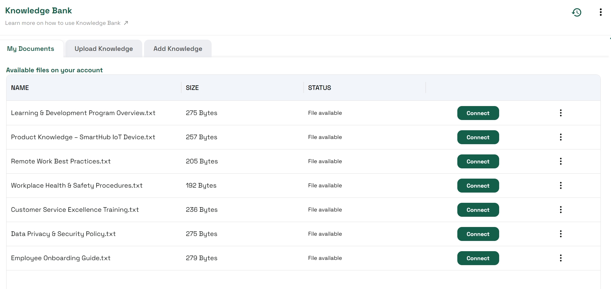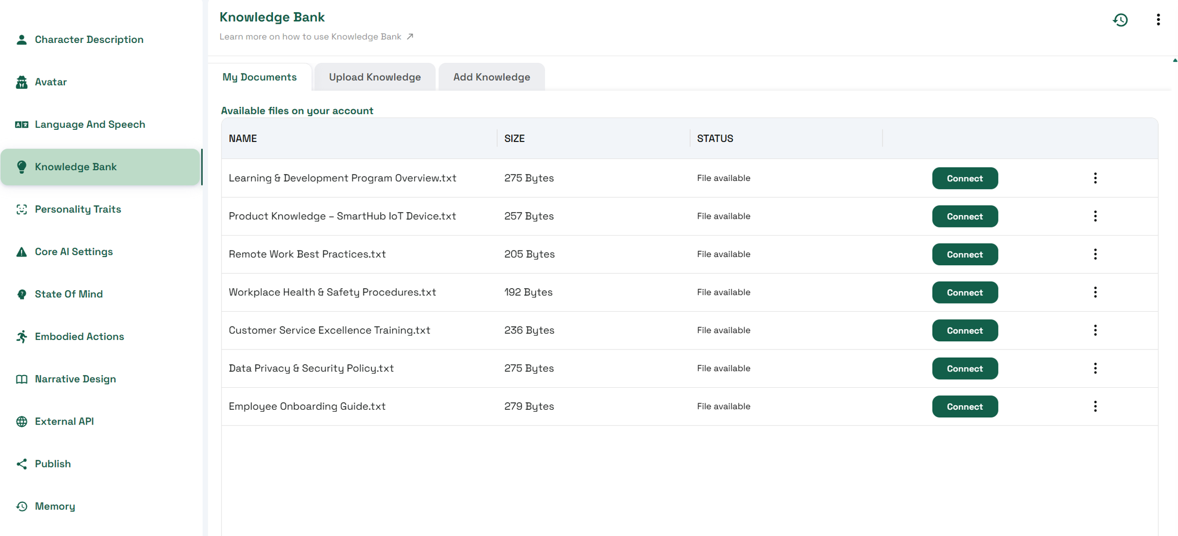 .txtfile format is supported.Once uploaded, files are stored in your account’s Knowledge Bank for use with any character.
