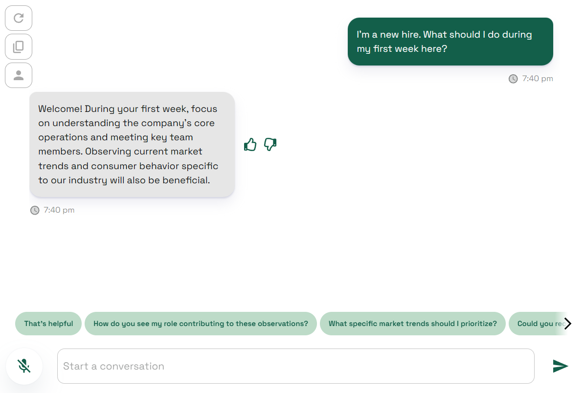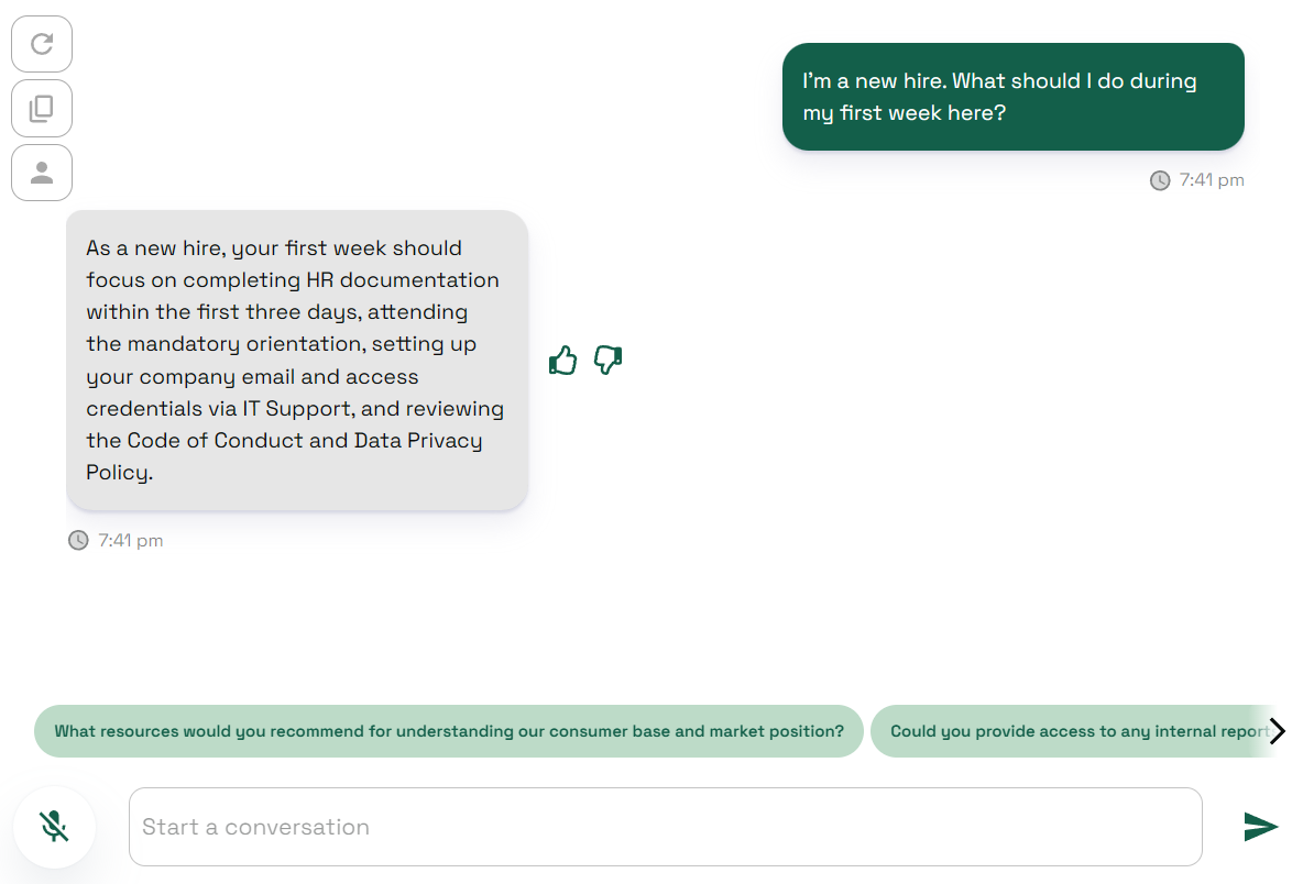 Result: This time, the character’s response is based on the exact steps provided in the Employee Onboarding Guide file.