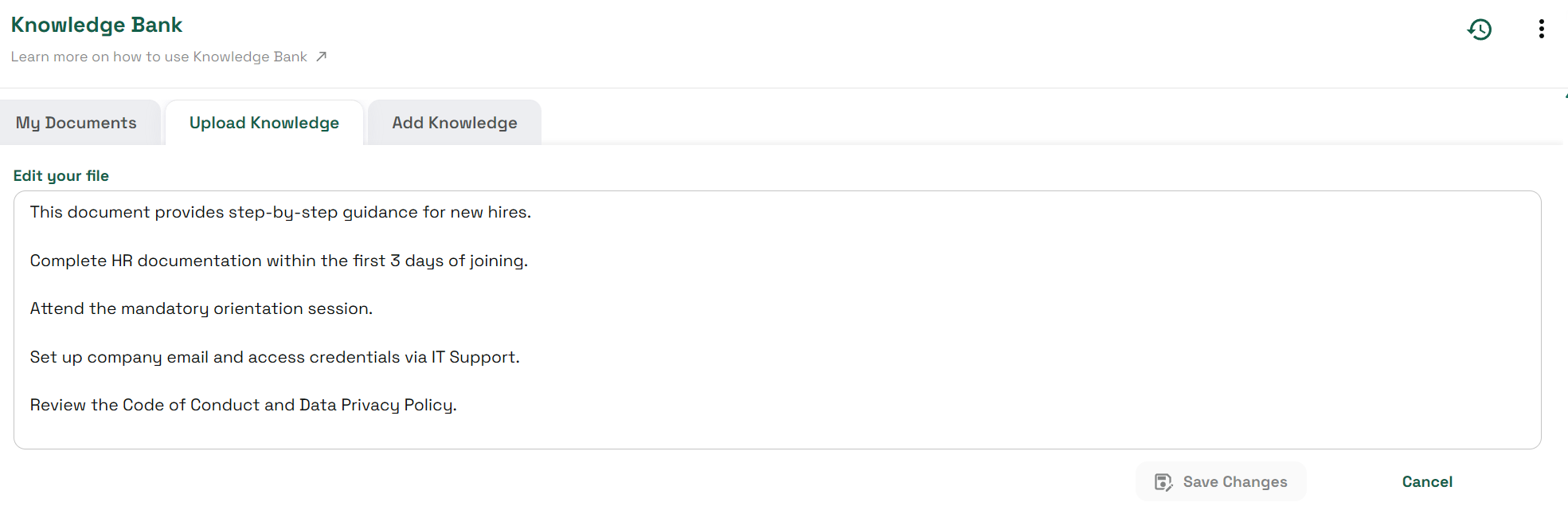 We uploaded a file named Employee Onboarding Guide.txt with the following content: