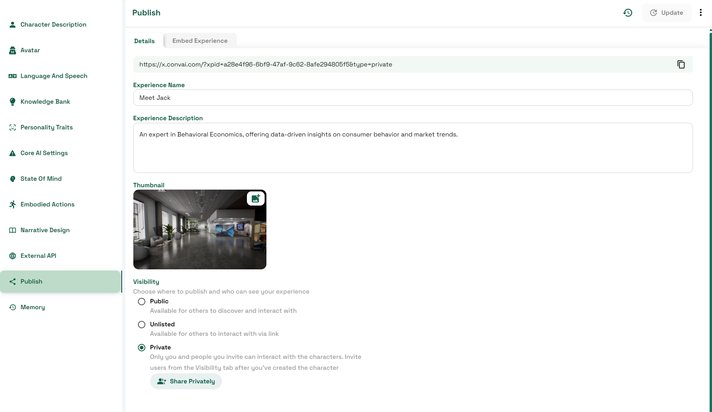 The Publish page allows you to share your fully created and customized Convai Experience with the world or with a selected group of people. From here, you can configure the title, description, thumbnail, and visibility settings for your experience, as well as generate links for sharing.