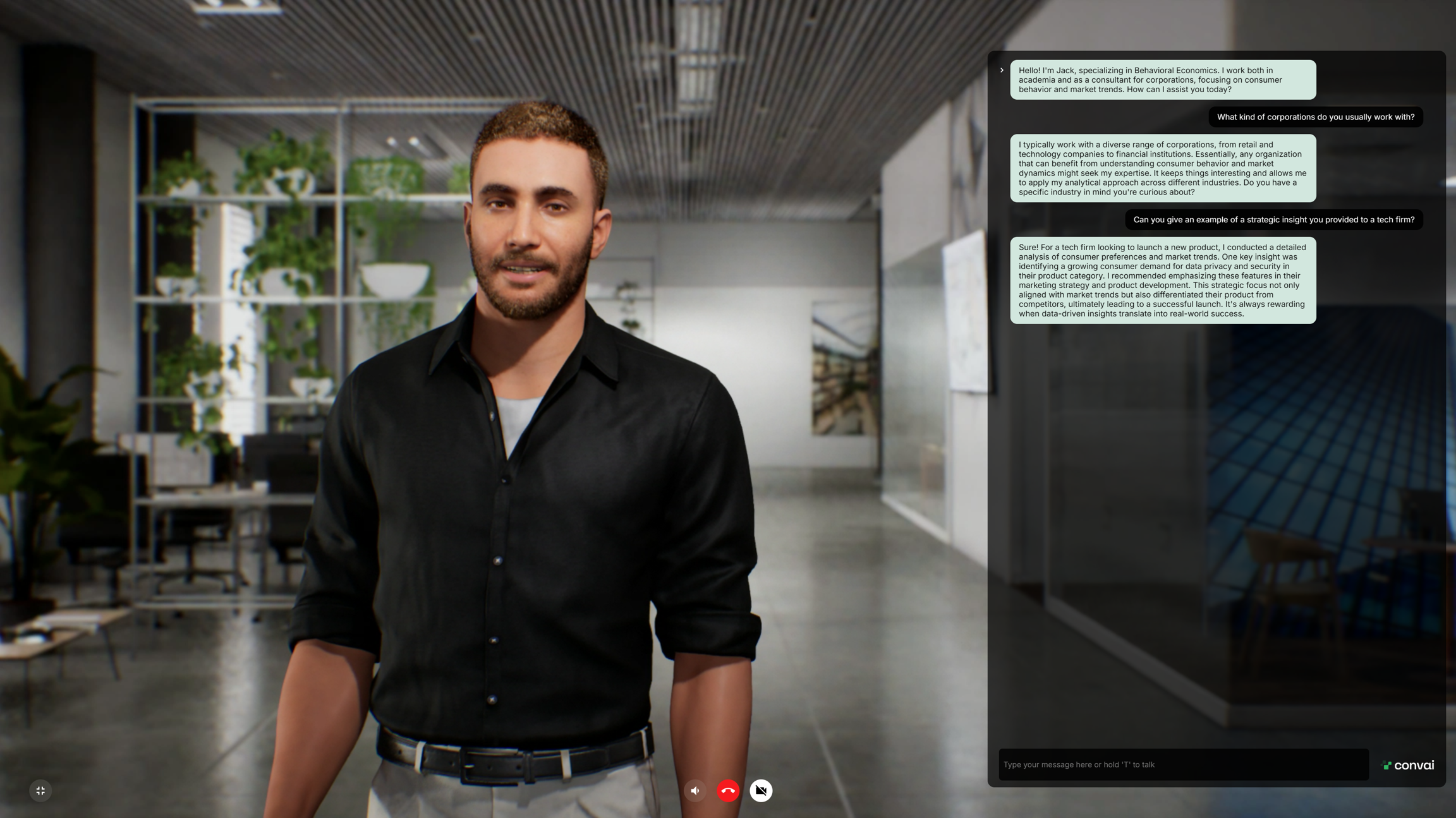Once you have created a character, it’s important to test how it interacts. Convai provides multiple ways to test your characters — from quick text and voice interactions to fully immersive video calls with custom avatars. This ensures you can refine personality, responsiveness, and interaction style before final deployment.