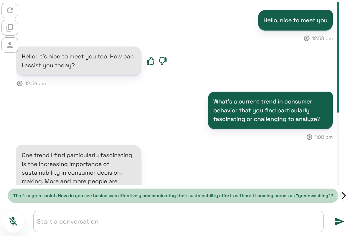 Conversation Starters: At the bottom of the Chatbox, you’ll see dynamically generated conversation starters and quick replies, tailored to the ongoing dialogue.