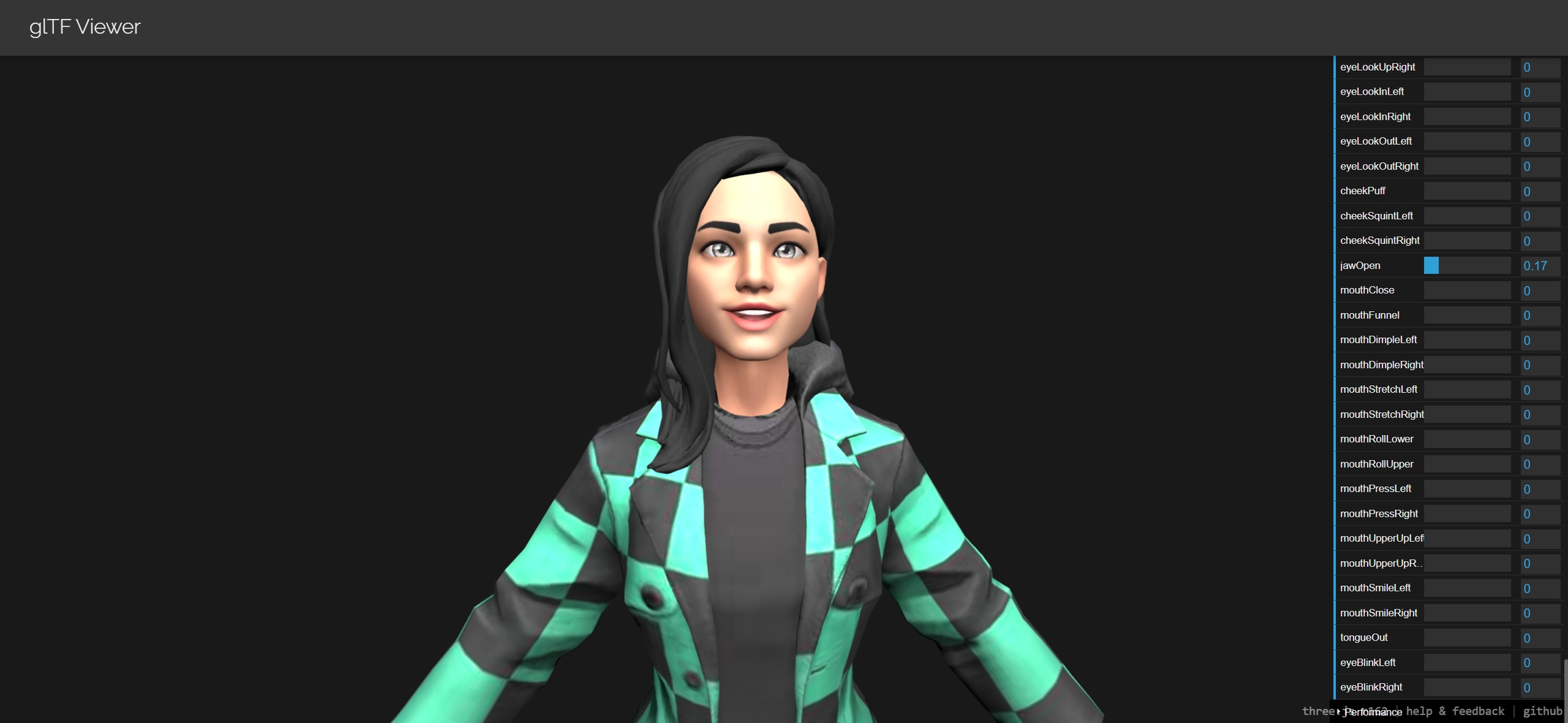 This glTF viewer is an excellent tool for quickly inspecting and visualizing the morph targets of your character without needing to import it into a 3D software or game engine. It allows you to see how each morph target affects the character's appearance, which can be helpful for understanding the available facial expressions, body poses, or other deformations.