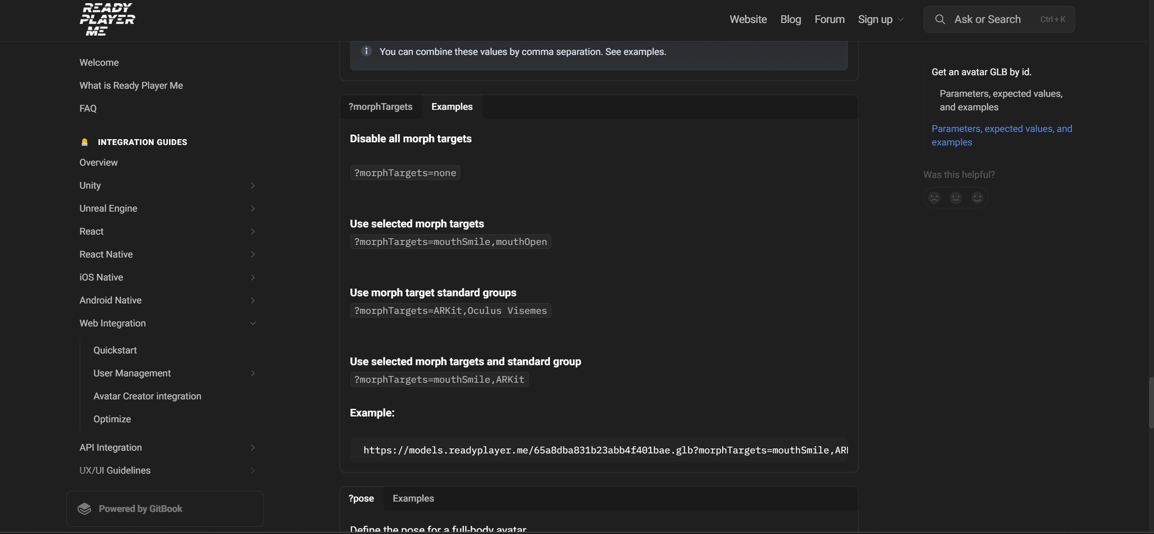 Morphs, also known as blend shapes or morph targets, are a way to deform or animate a 3D model's mesh to create different expressions or appearances. ReadyPlayer.me characters can be animated using morphs.
